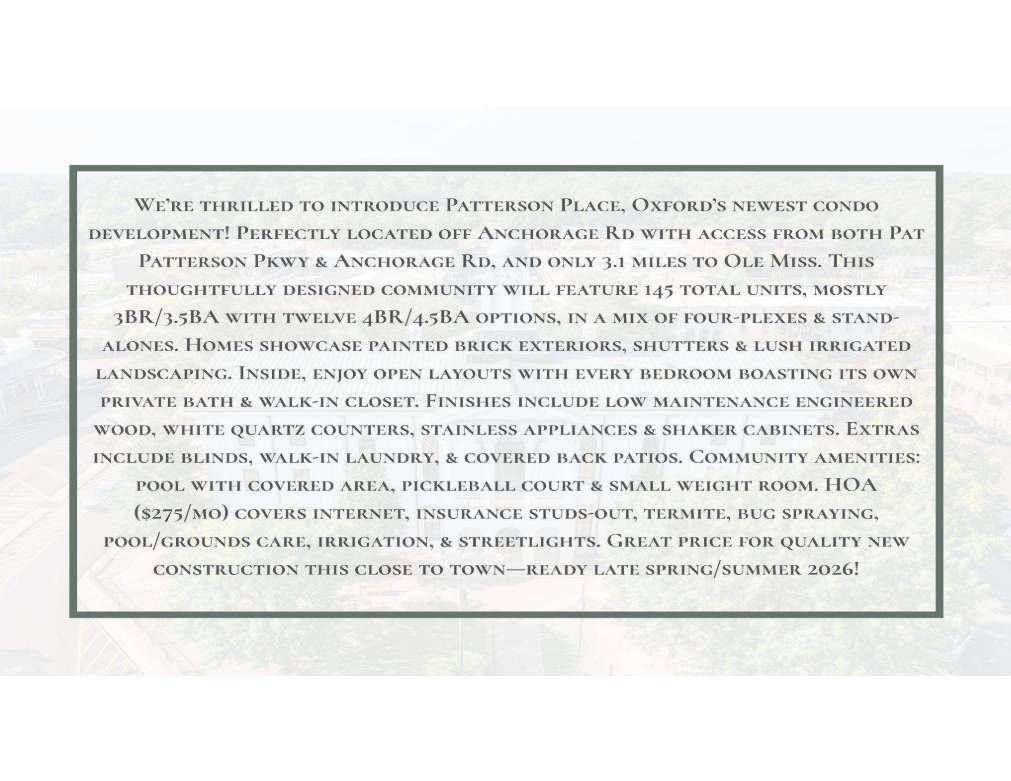 Located in Oxford's newest development, Patterson Place, this 3-bedroom, 3.5-bath home sits just off Anchorage Road, minutes from Jackson Avenue and The University. The thoughtfully designed layout provides private en-suite bathrooms and walk-in closets for each bedroom. Planned interior finishes include stainless steel appliances, quartz countertops, and vinyl hardwood-style flooring. Rent is $3,300 with a $3,300 deposit and includes internet and lawn care. Residents will enjoy access to a community pool and fitness center upon completion.